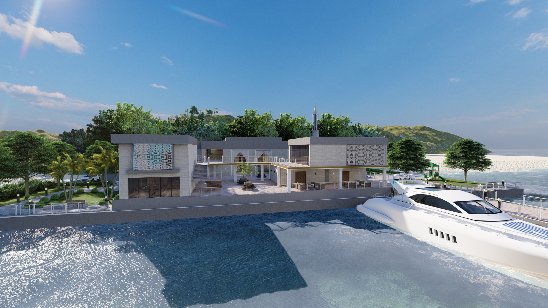 Designing a mosque (masjid) near the sea offers a unique opportunity to integrate elements of natural beauty, tranquility, and symbolism into the architectural and landscape design. Here's a description of how such a mosque might be envisioned: